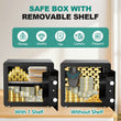 Safe Box For Home Use: The external dimensions are 9.84"D x13.78"W x 9.84"H. Net weight: 7.2kg. Equipped with a removable shelf, providing a spacious interior space for the safe.lt also comes with a fireproof waterproof safe bag for important documents.